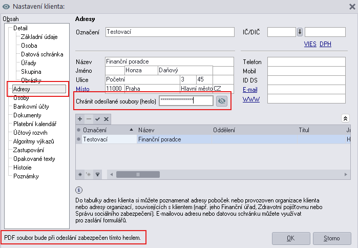 Dále můžete heslo nastavit k vybrané Adrese: