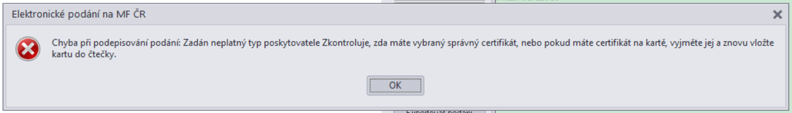 Při elektronickém podání formuláře pomocí certifikátu se zobrazí chybové hlášení: Neplatný typ poskytovatele