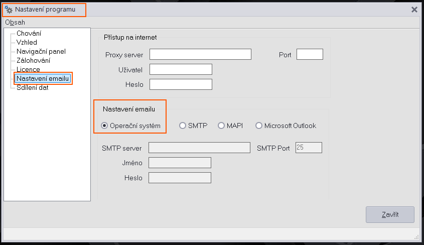 V programu STEREO je oproti FORM studiu navíc možnost nastavení e-mailu přímo v programu. Pokud máte nastavení správně provedeno (viz výše), ve STEREO bude nastaveno následovně (viz obrázek níže). Do nastavení se dostanete přes nabídku: Ostatní – Nastavení programu – Nastavení e-mailu.
